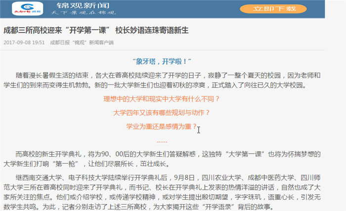 成都三所高校迎来“开学第一课” 校长妙语连珠寄语新生