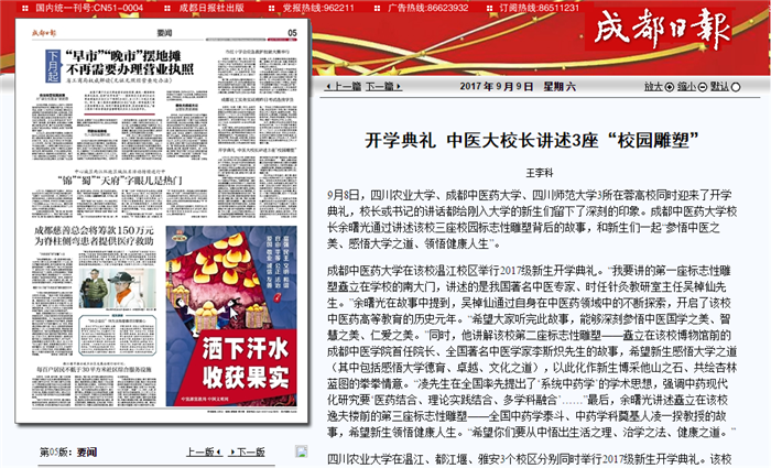 9月8日,四川农业大学、Beat365中文官方网站、四川师范大学3所在蓉高校同时迎来了开学典礼,校长或书记的讲话都给刚入大学的新生们留下了深刻的印象。Beat365中文官方网站校长余曙光通过讲述该校三座校园标志性雕塑背后的故事,和新生们一起“参悟中医之美、感悟大学之道、领悟健康人生”。