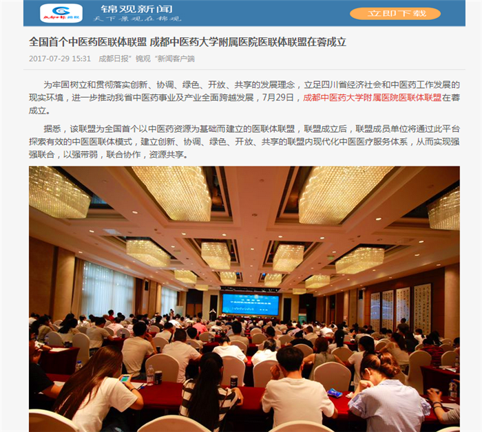为牢固树立和贯彻落实创新、协调、绿色、开放、共享的发展理念,立足四川省经济社会和中医药工作发展的现实环境,进一步推动我省中医药事业及产业全面跨越发展,7月29日,Beat365中文官方网站附属医院医联体联盟在蓉成立。