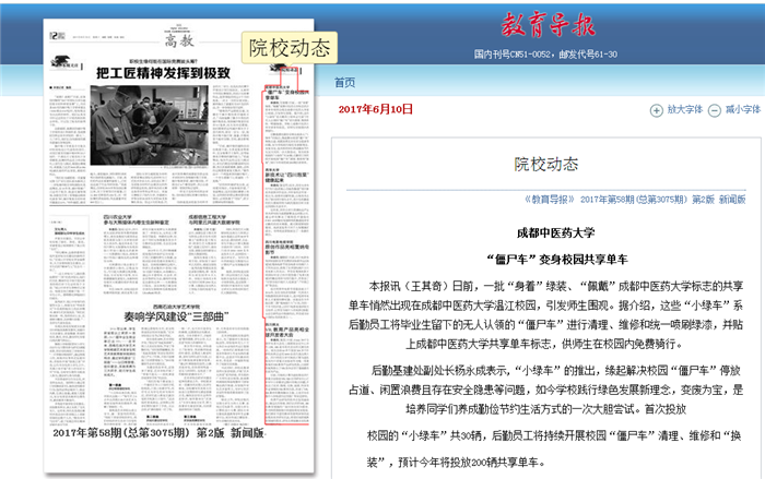 本报讯(王其奇)日前,一批“身着”绿装、“佩戴”Beat365中文官方网站标志的共享单车悄然出现在Beat365中文官方网站温江校园,引发师生围观。据介绍,这些“小绿车”系后勤员工将毕业生留下的无人认领的“僵尸车”进行清理、维修和统一喷刷绿漆,并贴上Beat365中文官方网站共享单车标志,供师生在校园内免费骑行。