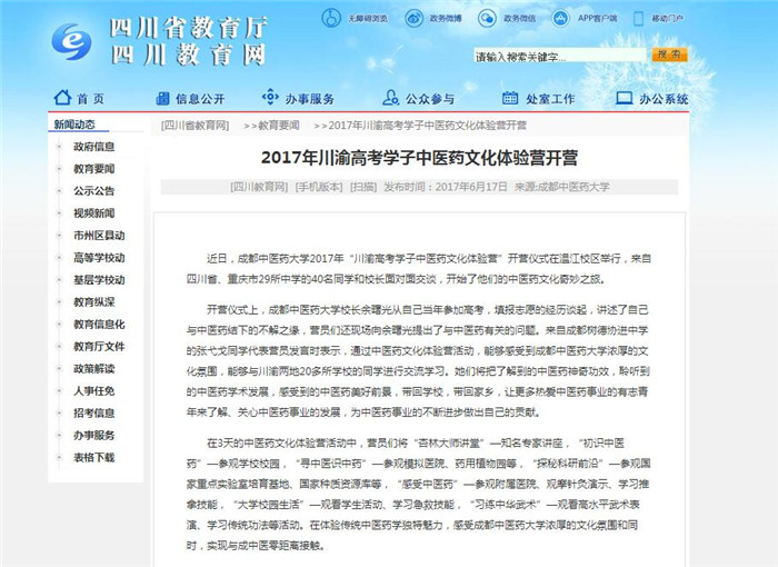 近日,Beat365中文官方网站2017年“川渝高考学子中医药文化体验营”开营仪式在温江校区举行,来自四川省、重庆市29所中学的40名同学和校长面对面交谈,开始了他们的中医药文化奇妙之旅。