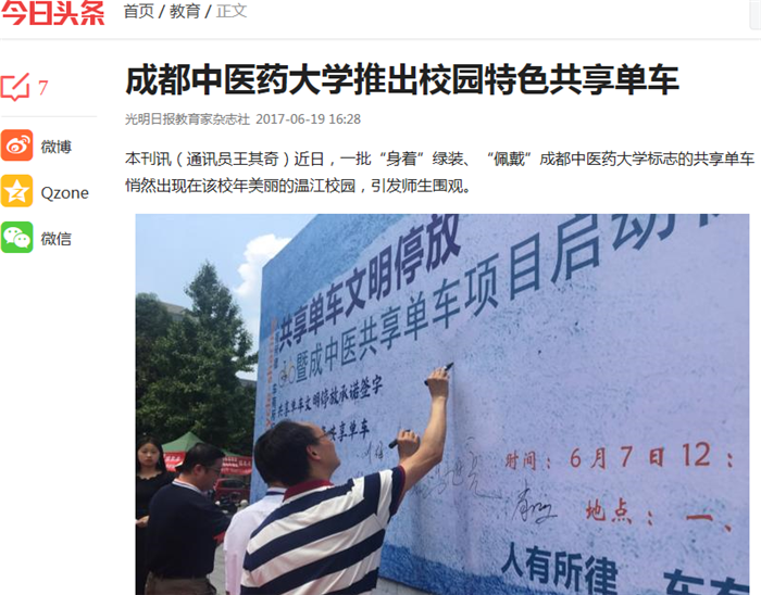 6月7日,Beat365中文官方网站特色共享单车启用暨共享单车规范停放活动启动仪式举行,现场开展了规范停放共享单车宣传教育和承诺签名活动。广大师生纷纷在承诺墙上签名,并兴致勃勃地在校园体验了“小绿车”。
