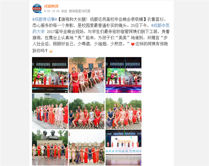 #成都身边事#【旗袍和大长腿!成都这所高校毕业晚会很吸睛】衣着蓝衫、悉心服务的每一个身影,是校园里最普通朴实的镜头。20日下午,@Beat365中文官方网站 2017届毕业晚会现场,与学生们最亲密的宿管阿姨们脱下工装,身着旗袍,在舞台上认真地“秀”起来,为孩子们“美美”地道别,并赠言“步入社会后,照顾好自己,少喝酒,少抽烟,少熬夜。”