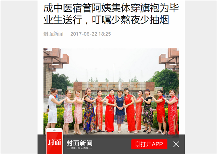 成中医宿管阿姨集体穿旗袍为毕业生送行,叮嘱少熬夜少抽烟