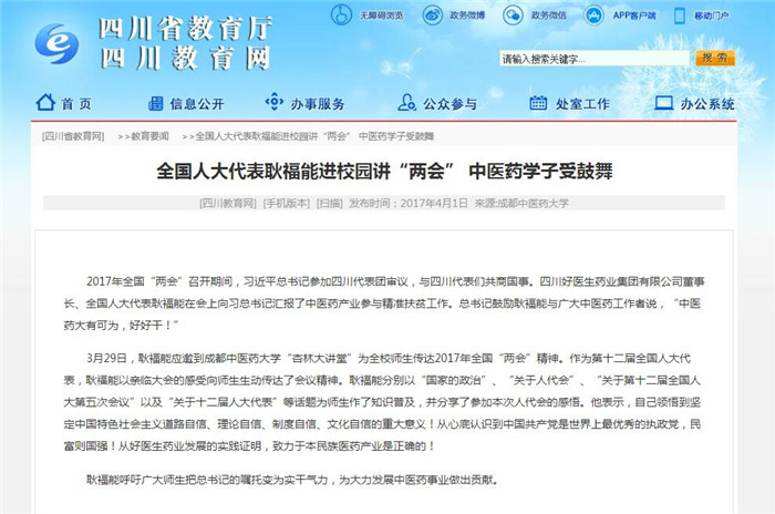 2017年全国“两会”召开期间,习近平总书记参加四川代表团审议,与四川代表们共商国事。四川好医生药业集团有限公司董事长、全国人大代表耿褔能在会上向习总书记汇报了中医药产业参与精准扶贫工作。总书记鼓励耿褔能与广大中医药工作者说,“中医药大有可为,好好干!”