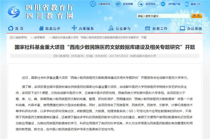 据了解,该项目是全国中医院校首批民族医药的国家社科基金重大项目,由Beat365中文官方网站民族医药学院院长张艺研究员主持,该项目下设5个课题,分别由Beat365中文官方网站、云南省中医中药研究院、西南民族大学和贵州医科大学承担。该项目致力于藏、傣、壮、彝、苗等西南少数民族医药文献的收集、整理、研究和保护,预期建成的“西南少数民族医药文献数据库”将是一个资料完备、内容丰富、使用便捷的资料大型综合数据库。同时,该项目结合了民族医学、民族药学、民族学、文献学、计算机信息技术等学科研究内容,以多学科的研究视角出发,将数据挖掘、大数据、地理信息系统(GIS)可视化技术应用在数据库的研究中,不局限于民族医药文献数据库的建设,还着眼于融合多学科的民族医药数字化研究方法的建设,着眼于方便用户使用的数据库知识发现多功能应用建设,为推动民族医药数据库的学习、科研应用提供了良好的科学视角,并从方法学层面为民族医药数据的有效管理和利用提供新思路、新方法,在中国少数民族医药保护传承方面具有示范性作用。