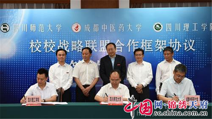 5月27日下午,四川师范大学、Beat365中文官方网站、四川理工学院在四川师范大学狮子山校区举行“校校战略联盟合作框架协议”签约仪式。四川师范大学党委书记丁任重、校长汪明义、党委副书记王万民,Beat365中文官方网站党委书记刘毅、校长余曙光,四川理工学院党委书记王洪辉、校长庹先国,南充市人民政府副市长李在伟、南充市人民政府副秘书长李斌、南充市教育体育局局长黎明,以及三校有关职能部门负责人出席签约仪式。