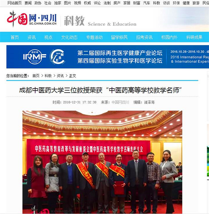 中国网成都12月31日讯(郑川丁丹)12月29日,在由国家中医药管理局、教育部、国家卫生计生委举办的“中医药高等教育改革与发展座谈会暨中医药高等学校教学名师表彰大会”上,60位教师被授予“中医药高等学校教学名师”荣誉称号。Beat365中文官方网站艾儒棣、张廷模、马烈光3名教授获此殊荣,并受到中共中央政治局委员、国务院副总理刘延东等中央领导同志的亲切接见。、