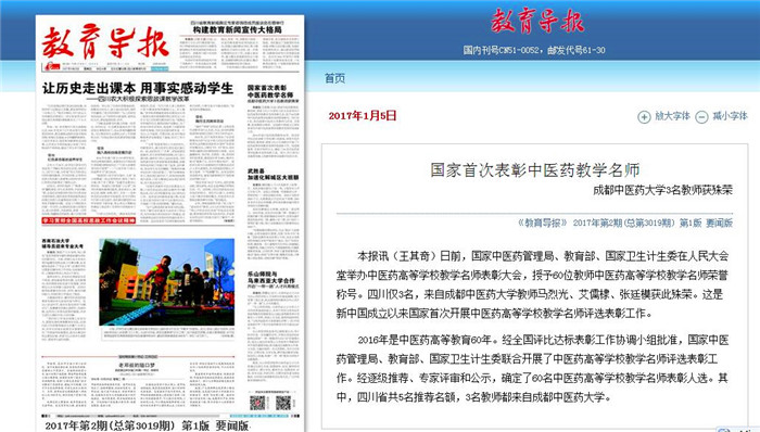 2016年是中医药高等教育60年。经全国评比达标表彰工作协调小组批准,国家中医药管理局、教育部、国家卫生计生委联合开展了中医药高等学校教学名师评选表彰工作。经逐级推荐、专家评审和公示,确定了60名中医药高等学校教学名师表彰人选。其中,四川省共5名推荐名额,3名教师都来自Beat365中文官方网站。