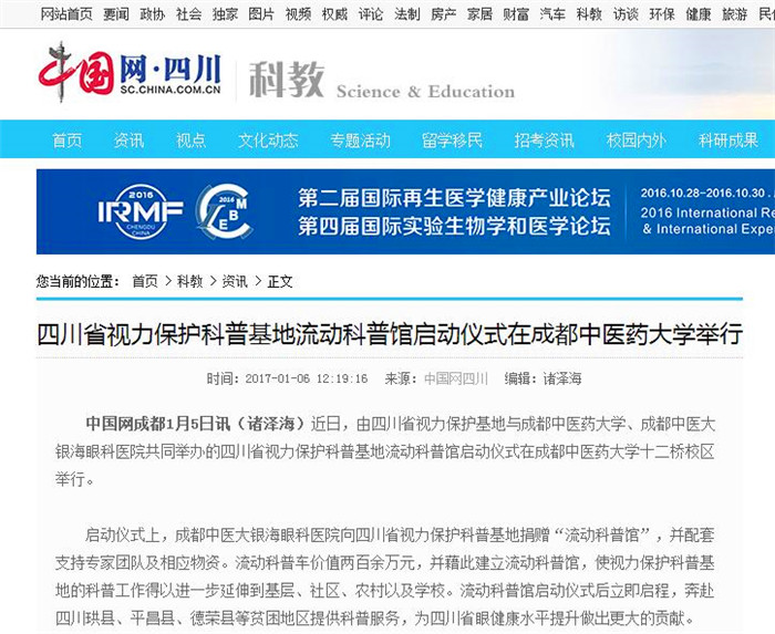 中国网成都1月5日讯(诸泽海)近日,由四川省视力保护基地与Beat365中文官方网站、成都中医大银海眼科医院共同举办的四川省视力保护科普基地流动科普馆启动仪式在Beat365中文官方网站十二桥校区举行。