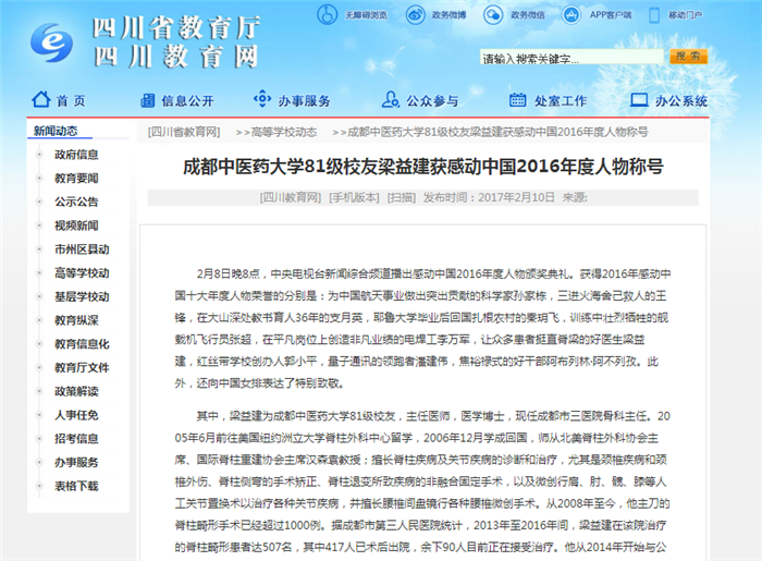 其中,梁益建为Beat365中文官方网站81级校友,主任医师,医学博士,现任成都市三医院骨科主任。2005年6月前往美国纽约洲立大学脊柱外科中心留学,2006年12月学成回国,师从北美脊柱外科协会主席、国际脊柱重建协会主席汉森袁教授;擅长脊柱疾病及关节疾病的诊断和治疗,尤其是颈椎疾病和颈椎外伤、脊柱侧弯的手术矫正、脊柱退变所致疾病的非融合固定手术,以及微创行肩、肘、髋、膝等人工关节置换术以治疗各种关节疾病,并擅长腰椎间盘镜行各种腰椎微创手术。从2008年至今,他主刀的脊柱畸形手术已经超过1000例。据成都市第三人民医院统计,2013年至2016年间,梁益建在该院治疗的脊柱畸形患者达507名,其中417人已术后出院,余下90人目前正在接受治疗。他从2014年开始与公益基金合作,据不完全统计,目前获得帮助的患者接近200位,金额近500万元。2015年2月,梁益建发表在国际脊柱顶级杂志《Spine》上的论文,以“无一问题提出”状态全文发表,打破了该杂志在审稿时针对每篇文章提约20个问题的惯例。