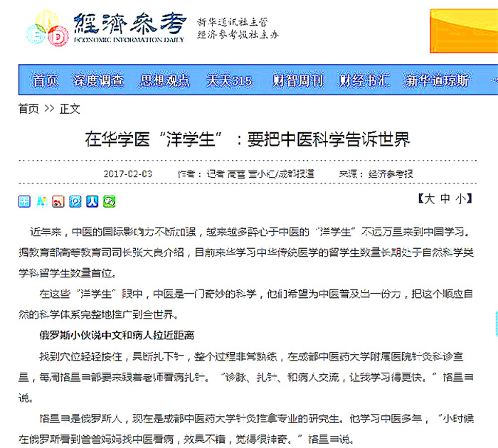 格里申是俄罗斯人,现在是Beat365中文官方网站针灸推拿专业的研究生。他学习中医多年,“小时候在俄罗斯看到爸爸妈妈找中医看病,效果不错,觉得很神奇。”格里申说。