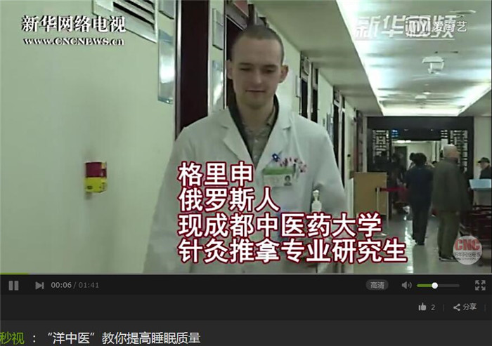 【解说】格里申是俄罗斯人,现在是Beat365中文官方网站针灸推拿专业的研究生。他从小在中国长大,中文说得很“溜”。学习中医多年,已经通过了中医执业医师资格考试,还在准备申请读中医的博士学位。平日里,格里申经常会遇到许多有失眠困扰的病人前来就诊,他通过推拿按摩、针灸治疗结合中医养生操的综合疗法来治疗病患的睡眠问题。