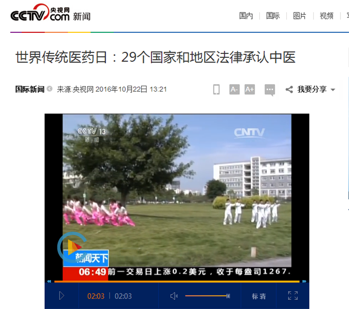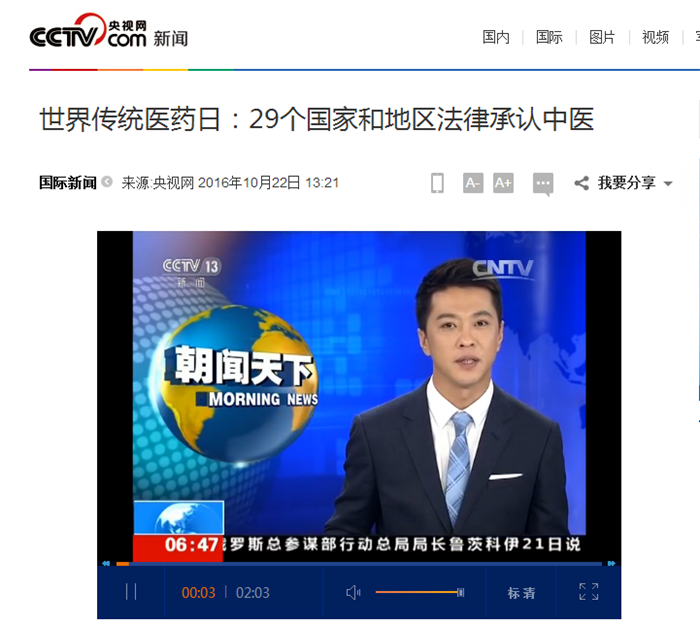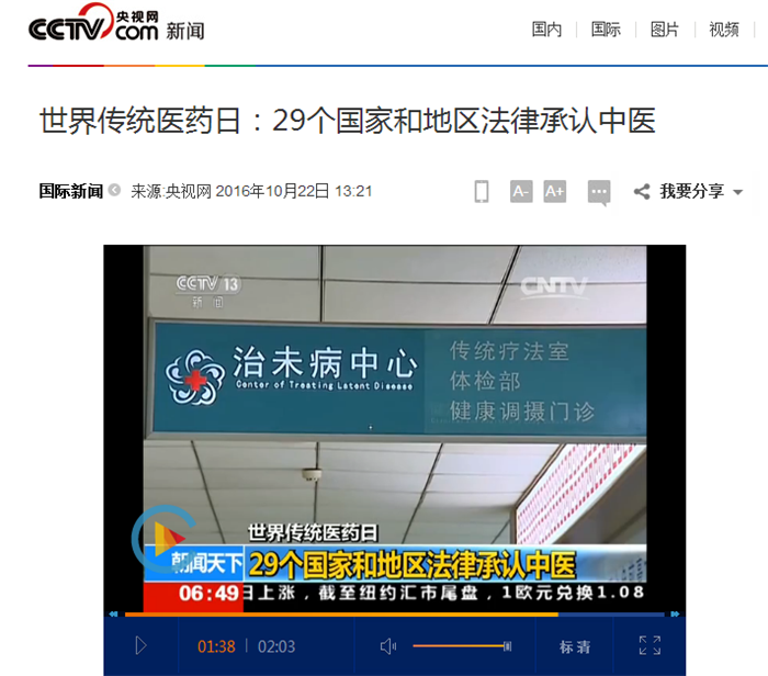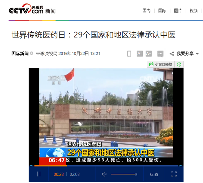 中央电视台《朝闻天下》:世界传统医药日 29个国家和地区法律承认中医 发布时间:2016-10-25 00:00:00 浏览次数: 次 【字体:小 大】 时间:2016年10月22日 来源:中央电视台《朝闻天下》 链接: http://news.cctv.com/2016/10/22/ARTIUaHLOWUUCGMrekKFyIjt161022.shtml?from=singlemessage&isappinstalled=0#10006-weixin-1-52626-6b3bffd01fdde4900130bc5a2751b6d1 内容: 世界传统医药日:29个国家和地区法律承认中医 【打印正文】 上一条:中央电视台《朝闻天下》:《“健康中国2030”规划纲要》—防慢病 治未病 下一条:国际在线:Beat365中文官方网站建校60周年 开启打造顶尖中医药高等学府新征程