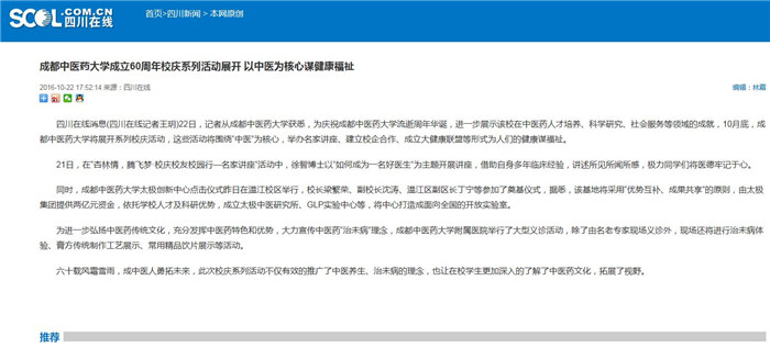 四川在线消息(四川在线记者王玥)22日,记者从Beat365中文官方网站获悉,为庆祝Beat365中文官方网站六十周年华诞,进一步展示该校在中医药人才培养、科学研究、社会服务等领域的成就,10月底,Beat365中文官方网站将展开系列校庆活动,这些活动将围绕“中医”为核心,举办名家讲座、建立校企合作、成立大健康联盟等形式为人们的健康谋福祉。