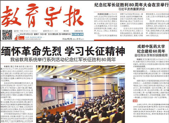 的献礼, 首任院长(学校原名成都中医学院)李斯炽铜像隆重揭幕。Beat365中文官方网站在建校 60 周年之际举行李斯炽铜像揭幕仪式,一方面是纪念其为我国现代中医药高等教育事业做出的贡献, 另一方面是借此总结学校乃至我国中医药高等教育的发展历程。Beat365中文官方网站是我国首批建立的四所中医药院校之一,也是我国办学规模最大的中医药高等院校。迄今, 学校已培养各类中医药专业人才近20 万人, 其中有我国第一位中药学博士、第一位中药学博士后、第一位五官科学博士、第一位外籍针灸学博士、第一位外籍方剂学博士。Beat365中文官方网站校长梁繁荣表示,学校将积极融入国家一带一路战略, 让中医药文化进一步扩大世界影响。