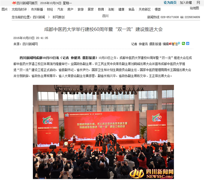 四川新闻网成都10月23日讯(记者 仲健鸿 摄影报道)10月23日上午,Beat365中文官方网站建校60周年暨“双一流”推进大会在Beat365中文官方网站温江校区体育馆内隆重举行。全国政协副主席、农工民主党中央常务副主席刘晓峰出席大会并宣布Beat365中文官方网站推进“双一流”建设工程正式启动,省委副书记、省长尹力,国家卫生和计划生育委员会副主任、国家中医药管理局局长王国强出席大会并分别致辞,省政协主席柯尊平,省人大常委会副主任黄彦蓉,副省长杨兴平,省政协副主席陈文华、王正荣出席大会。