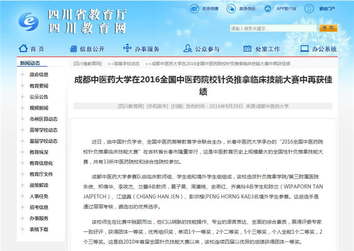 近日,由中国针灸学会、全国中医药高等教育学会联合主办,长春中医药大学承办的“2016全国中医药院校针灸推拿临床技能大赛”在吉林省长春市隆重举行,这是中医教育历史上规模最大的全国性针灸推拿技能大赛,共有33所中医药院校和综合性院校参加。