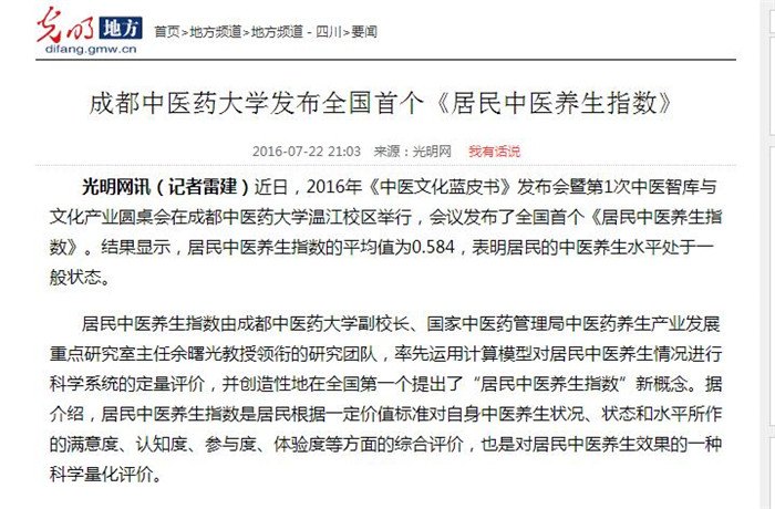 光明网讯(记者雷建)近日,2016年《中医文化蓝皮书》发布会暨第1次中医智库与文化产业圆桌会在Beat365中文官方网站温江校区举行,会议发布了全国首个《居民中医养生指数》。结果显示,居民中医养生指数的平均值为0.584,表明居民的中医养生水平处于一般状态。