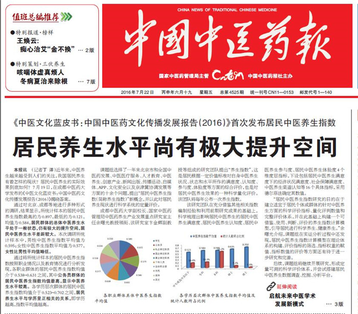 《中医文化蓝皮书:中国中医药文化传播发展报告(2016)》首次发布居民中医养生指数