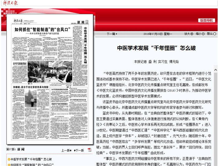 “事实上,中西方医药文明碰撞给中医带来的所有不安,正是源于‘古典自然整体型’中医药模式的历史局限和本身的僵化。”毛嘉陵认为,中医药作为一门应用性学科,必须由基础学科的成果来不断充实,然而能够支撑“古典自然整体型”中医药模式发展的中国古代科学技术基本上已经消失,“要从根本上破解中医的这个‘千年怪圈’,就必须从中医药文化着手,推动中医药模式升级和更新换代。”