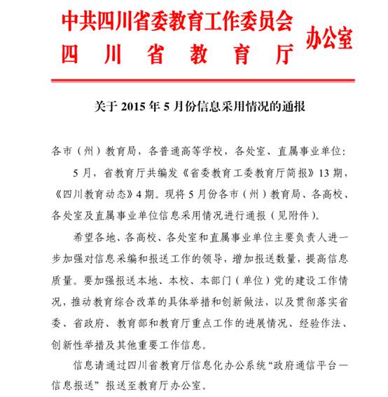 学校在《四川省教育动态》《四川教育简报》刊发信息排名第五位 发布时间:2016-06-17 00:00:00 浏览次数: 次 【字体:小 大】 【打印正文】 上一条:《天府早报》:“我是校园创客”之张逊朗 下一条:四川教育网:Beat365中文官方网站邀请院士把关博士研究生毕业答辩
