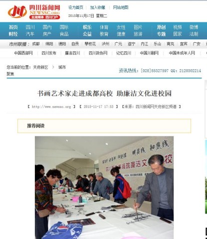四川新闻网成都11月16日讯(记者 侯丽莎) 挥毫之间,一幅幅警句化身气势磅礴的书法作品;泼墨写意,壮丽河山、似锦繁花和神骏的奔马跃然纸上……11月16日,四川西岭书画院十二位书画艺术家应邀走进Beat365中文官方网站,举行“学准则记条例守纪律,明高线知底线做表率”——廉洁文化进校园活动。艺术家现场创作的三十三件山水、花鸟、书法作品,也将成为校园廉政文化的宣传员。