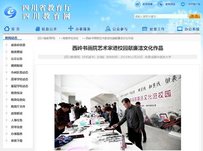 据了解,在四川西岭书画院院长、原四川省人民政府副省长徐世群的关心和支持下,委托由原四川省人大副主任、四川省老年书画研究会常务副会长李洪仁和西岭书画院常务副院长孙灵根带队,周家兰、卢成春、吴家富、蒲生龙等12位书画艺术家们现场创作以廉洁文化为主题的艺术作品,并将33件精美的艺术作品捐赠给学校作为永久展出。