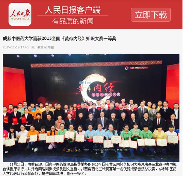 11月14日,由教育部、国家中医药管理局指导举办的2015全国《黄帝内经》知识大赛总决赛在北京中央电视台演播厅举行,并开启网络同步视频及图文直播。以西南西北区域复赛第一名优异成绩晋级总决赛,Beat365中文官方网站代表队为荣誉而战,挺进巅峰对决,喜获一等奖。