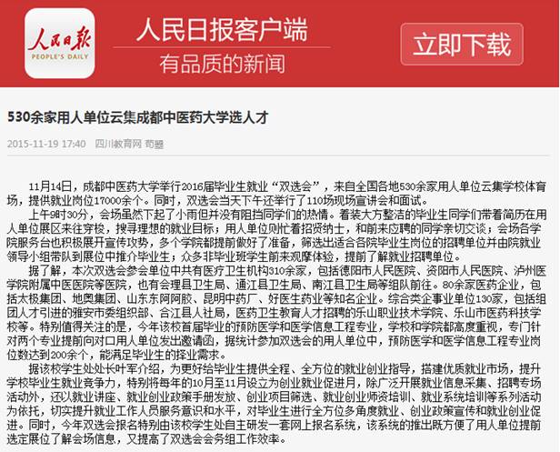 据了解,本次双选会参会单位中共有医疗卫生机构310余家,包括德阳市人民医院、资阳市人民医院、泸州医学院附属中医医院等医院,也有会理县卫生局、通江县卫生局、南江县卫生局等组队前往。80余家医药企业,包括太极集团、地奥集团、山东东阿阿胶、昆明中药厂、好医生药业等知名企业。综合类企事业单位130家,包括组团人才引进的雅安市委组织部、合江县人社局,医药卫生教育人才招聘的乐山职业技术学院、乐山市医药科技学校等。特别值得关注的是,今年该校首届毕业的预防医学和医学信息工程专业,学校和学院都高度重视,专门针对两个专业提前向对口用人单位发出邀请函,据统计参加双选会的用人单位中,预防医学和医学信息工程专业岗位数达到200余个,能满足毕业生的择业需求。