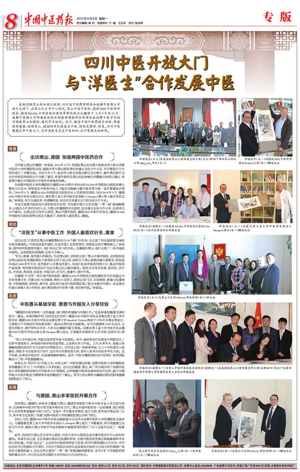 在我国驻黑山共和国大使馆、四川省中医药管理局和Beat365中文官方网站的大支持下,应黑山巴尔市中心医院、黑山中国中医院、德国SMS中医科学协会、德国SiLiMa中西医结合医院等单位的正式邀请下,5月9日至15日,Beat365中文官方网站附属医院院长钟森率领医疗合作项目洽谈暨中医学术访问团赴黑山和德国,进行学术访问。近日,接受中国中医药报专访时,钟森很有感触,他称黑山、德国的市民很喜欢中医,特别是推拿、针灸,四川中医愿意打开中医大门,与外国医生交流中医知识,让中医药走向世界。