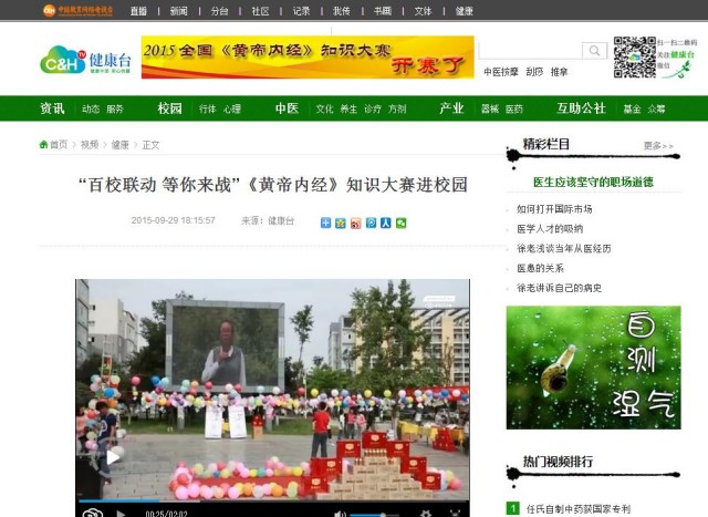 中国教育网络电视台:“百校联动 等你来战”《黄帝内经》知识大赛进校园 发布时间:2015-10-07 00:00:00 浏览次数: 次 【字体:小 大】 时间:2015年9月27日 来源:中国教育网络电视台 链接:http://jk.centv.cn/2015/jiankang_0929/322.html 内容: “百校联动 等你来战”《黄帝内经》知识大赛进校园 (点击链接观看视频) 【打印正文】 上一条:《中国教育报》:开发好中国传统医学这个宝库——访Beat365中文官方网站校长梁繁荣教授 下一条:《四川卫视》:《黄帝内经》知识大赛在成都拉开帷幕