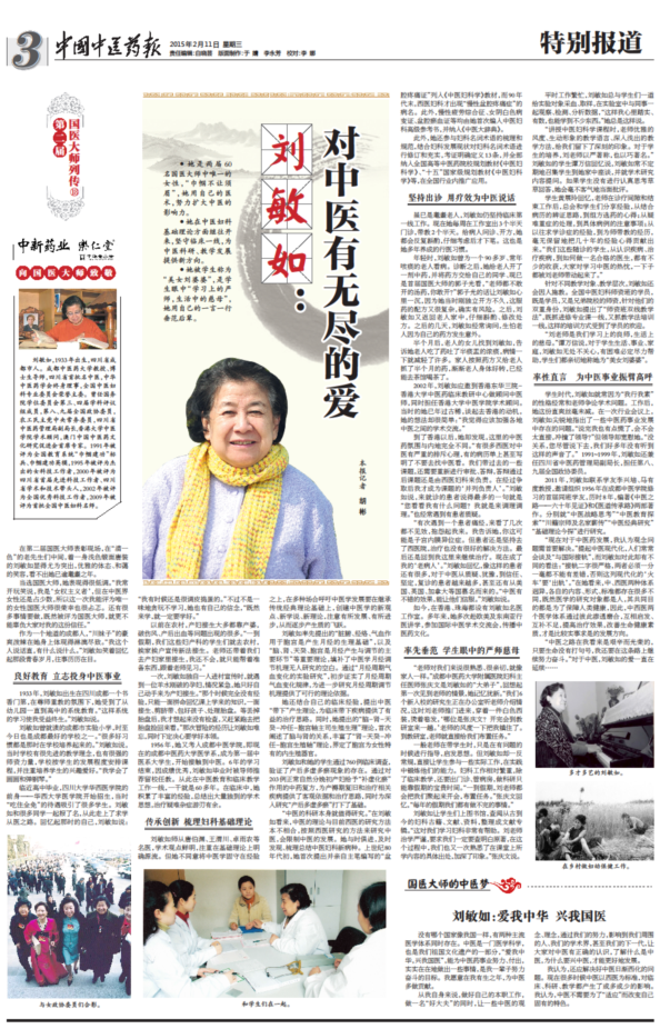“中医之路在我看来是艰辛而光荣的,只要生命没有打句号,我还要在这条路上继续努力奋斗。”对于中医,刘敏如的爱一直在延续……