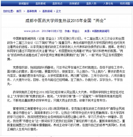 中国教育新闻网讯(记者 李益众)3 月3 日到3月15日,十二届全国人大三次会议和全国政协十二届三次会议(以下简称“两会”)隆重召开。身处Beat365中文官方网站校园的师生也时刻关注着两会的进程,从李克强总理的政府工作报告到人大代表和政协委员的议案、提案,老师和同学通过不同的形式关注着“两会”,校园里到处充满着对“两会”探讨和思考的氛围,“两会”的各种热点话题也成了成中医师生课前课后要摆的“龙门阵”,一股两会风正在校园里吹拂。