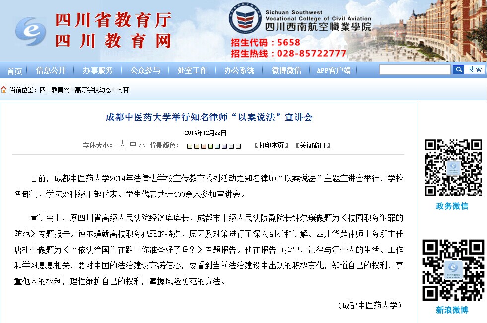 宣讲会上,原四川省高级人民法院经济庭庭长、成都市中级人民法院副院长钟尔璞做题为《校园职务犯罪的防范》专题报告。钟尔璞就高校职务犯罪的特点、原因及对策进行了深入剖析和讲解。四川华楚律师事务所主任唐礼全做题为《“依法治国”在路上你准备好了吗?》专题报告。他在报告中指出,法律与每个人的生活、工作和学习息息相关,要对中国的法治建设充满信心,要看到当前法治建设中出现的积极变化,知道自己的权利,尊重他人的权利,理性维护自己的权利,掌握风险防范的方法。