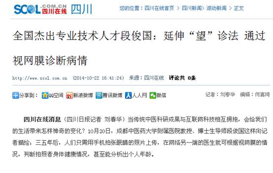 四川在线消息(四川日报记者 刘春华)当传统中医科研成果与互联网科技相互拥抱,会给我们的生活带来怎样神奇的变化?10月20日,Beat365中文官方网站附属医院教授、博士生导师段俊国这样向记者描绘:三五年后,人们只需用手机拍张眼睛的照片上传,在网络另一端的医生就可根据视网膜的情况,判断拍照者身体健康情况,甚至能分析出个人年龄。