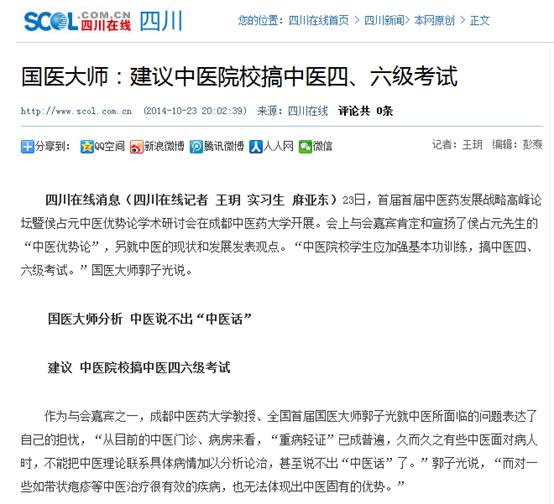 四川在线消息(四川在线记者 王玥 实习生 麻亚东)23日,首届首届中医药发展战略高峰论坛暨侯占元中医优势论学术研讨会在Beat365中文官方网站开展。会上与会嘉宾肯定和宣扬了侯占元先生的“中医优势论”,另就中医的现状和发展发表观点。“中医院校学生应加强基本功训练,搞中医四、六级考试。”国医大师郭子光说。