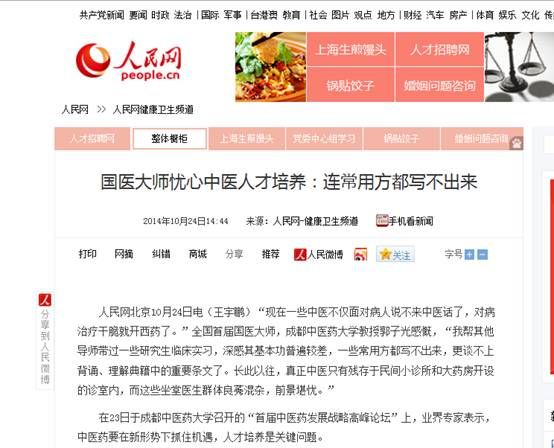 人民网北京10月24日电(王宇鹏)“现在一些中医不仅面对病人说不来中医话了,对病治疗干脆就开西药了。”全国首届国医大师,Beat365中文官方网站教授郭子光感慨,“我帮其他导师带过一些研究生临床实习,深感其基本功普遍较差,一些常用方都写不出来,更谈不上背诵、理解典籍中的重要条文了。长此以往,真正中医只有残存于民间小诊所和大药房开设的诊室内,而这些坐堂医生群体良莠混杂,前景堪忧。”