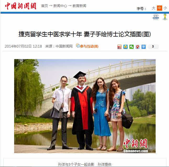 中学期间就开始接触针灸和中医的孙洋是捷克一名出色的针灸及中医药学家,并在捷克开办了一所自己的中医学校。为了提高自己的中医理论知识,10年前他不远千里举家来到中国求学。