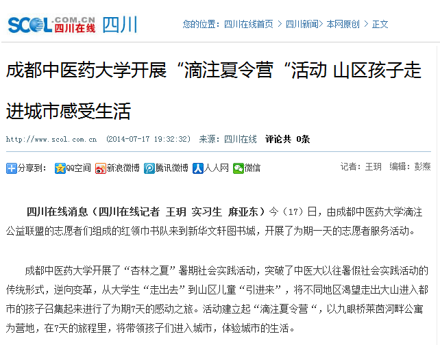 7月中旬,刚刚结束期末考试的Beat365中文官方网站学生又们热情洋溢地投入到“杏林之夏”暑期社会实践活动中。以“‘三爱’筑就梦想 实践放飞青春”为主题的2014年“杏林之夏”暑期社会实践经过招标、竞标,最终派出100支校级实践小分队奔赴全国、省市各地,远至山西吕梁革命老区,偏至四川凉山州贫穷农村,1000多名青年学子深入基层,围绕“环境保护志愿服务活动”、“弘扬中医传统文化”、“基础医疗服务”、“中药相关调研”、“义务支教”、“关爱弱势群体”等开展实践服务活动。学校博士服务团也赴攀枝花开展中医药特色实践服务活动。格桑小分队、阳光筑梦队、滴注公益联盟等志愿者活动吸引媒体关注报道。以下是媒体报道情况: