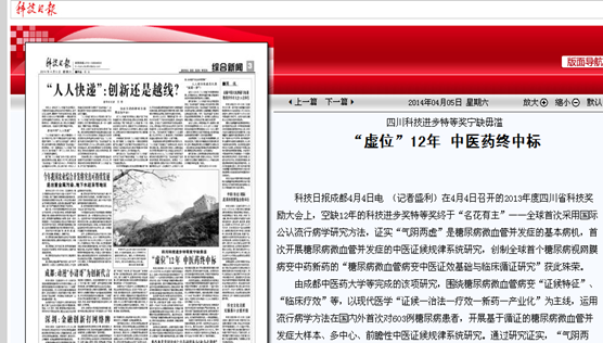 科技日报成都4月4日电 (记者盛利)在4月4日召开的2013年度四川省科技奖励大会上,空缺12年的科技进步奖特等奖终于“名花有主”——全球首次采用国际公认流行病学研究方法,证实“气阴两虚”是糖尿病微血管并发症的基本病机,首次开展糖尿病微血管并发症的中医证候规律系统研究,创制全球首个糖尿病视网膜病变中药新药的“糖尿病微血管病变中医证效基础与临床循证研究”获此殊荣。