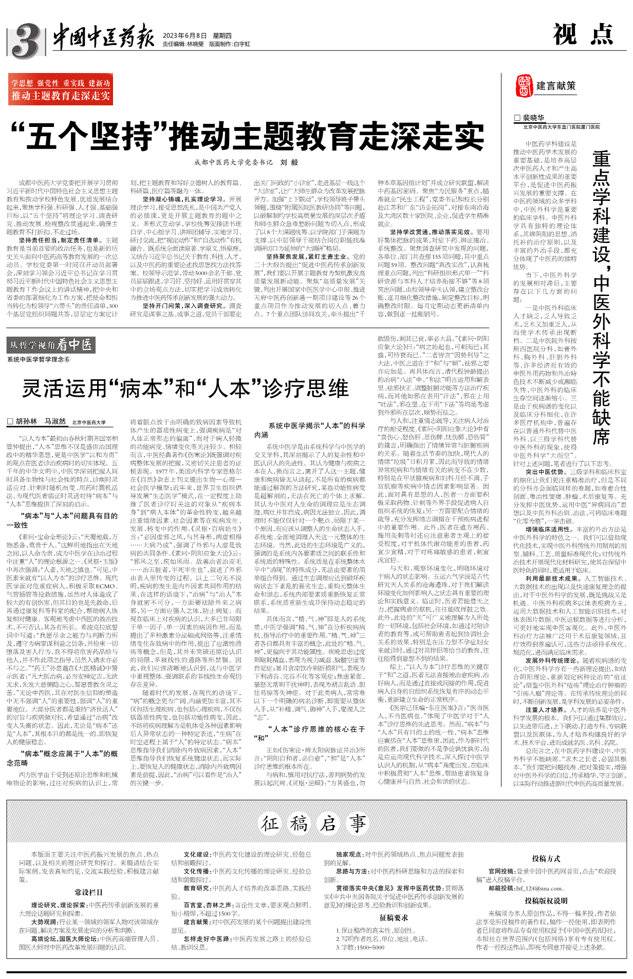 坚持聚焦发展,紧盯主责主业。党的二十大报告提出“促进中医药传承创新发展”,我们要以开展主题教育为契机激发高质量发展新动能。聚焦“高质量发展”关键,列出开展国家中医医学中心申报、推进天府中医药创新港一期项目建设等26个重点项目作为推动发展的切入点、着力点。7个重点团队协同攻关,牵头提出“千种本草基因组计划”并成立研究联盟,解读中药基因密码。聚焦“为民服务”重点,瞄准就业“民生工程”,党委书记和校长分别赴江苏和广东“访企拓岗”,对接东南沿海及大湾区数十家医院、企业,促进学生精准就业。