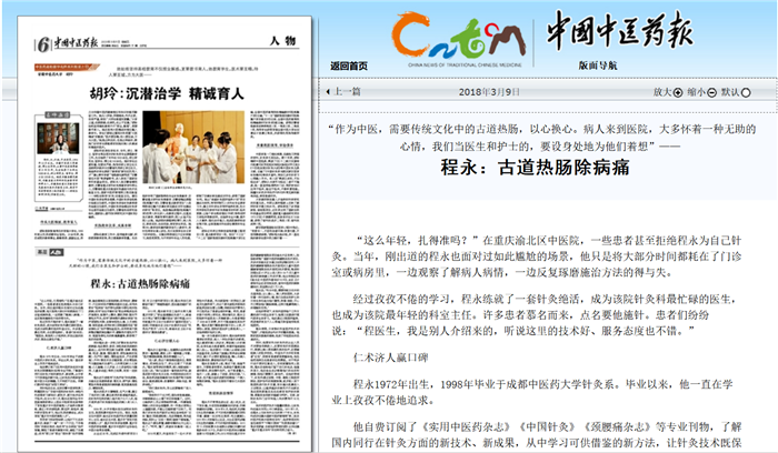 2006年,34岁的程永担任该院针灸科主任,是医院最年轻的科主任。现在,他是主任中医师、渝北区针灸医疗技术质量控制中心主任、渝北区名中医、重庆市“首批中医药高级人才”、重庆市针灸学会理事、重庆市中医药学会理事、重庆市中医药行业协会名中医分会常务理事。