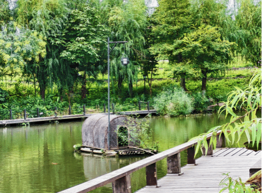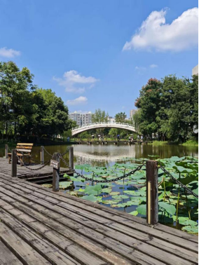 照片解说:木质栈桥轻吻湖面,将青春的足迹引向水中央的“时光小船”。澄澈的湖水如镜,浮萍摇曳,倒映着垂柳依依、丛林葱郁。阳光穿透叶隙,织成金色的网,洒下满湖碎金。这方秘境,是校园里未被打扰的绿洲,我们课余常在此静坐读书、畅谈理想。它不仅见证了我们的成长与欢笑,更以蓬勃的生机诠释着祖国绿水青山的美丽画卷。愿以镜头定格这份宁静与生机,歌颂祖国的生态之美,留下青春里最诗意的注脚。
