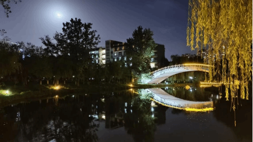 照片解说: 清晨的自习书桌,晨曦把影子拉得悠长,桌椅一同醒来,仿佛要与成中医人一起迎接早读时光;傍晚的花园一角,路灯晕开暖黄的光,成中医学子匆忙的身影穿梭其中,唤起独属于夜的一丝温柔;还有连接皎月与流水的百部桥,桥畔柳丝轻垂,地上万物在水面晕染成画,将悠悠大学时光都滤成了静谧的诗。