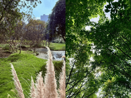 照片解说:这两张图片都展示了成中医出色的绿化情况以及优美的校园环境。第一张照片展示了校园里的一处生态小景,绿草如茵,蒲苇飘摇,小塘静谧,树木错落,远处的建筑若隐若现。第二张照片我以仰拍的视角捕拍校园小路上的绿意盎然,阳光透过缝隙洒落,为我们的军训撑起了一把保护伞。相信我们大一新生在今后的军训以及学习中像绿植一样在阳光下闪闪发光。