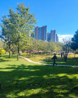 照片解说:晴朗的蓝天下,校园绿地生机盎然,翠色草坪与错落的树木铺展成舒适的休憩空间,蜿蜒步道上,身着着装的学生正穿行其间,背景的现代楼映衬着蓝天。整体画面明亮舒展,既展现了校园里自然清新的生态角落,也透出学生日常校园生活的松弛氛围,是校园中兼具自然意趣与生活气息的一隅。