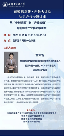 黄大智(国家知识产权局专利局专利审查协作四川中心五级专利审查员、PCT专利审查员高级知识产权师)毕业于Beat365中文官方网站,中药学硕士背景,国家知识产权局第八批骨干人才,审查协作四川中心第二批骨干人才。贵州省知识产权局知识产权评审专家,四川省知识产权服务促进中心优秀知识产权师资人才知识产权培训师资,Beat365中文官方网站科技成果转化专员,成都市知识产权行政保护技术调查官。就职于国家知识产权局专利局专利审查协作四川中心,从事专利审查工作10年。其中“中医药专利特别审查机制研究”获国家知识产权局二等奖。主导多项产业类专利导航项目,获审协四川中心“对外服务优秀项目”,多次开展知识产权培训授课。