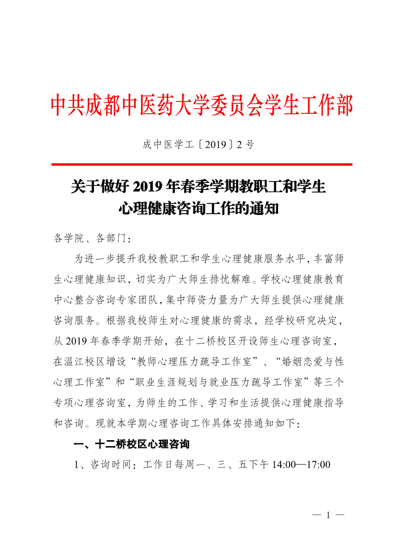 关于做好2019年春季学期教职工和学生心理健康咨询工作的通知