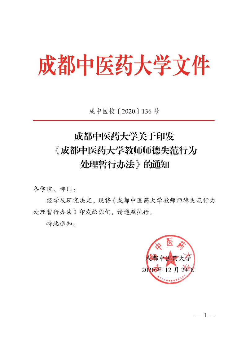成中医校〔2020〕136号:Beat365中文官方网站关于印发《Beat365中文官方网站教师师德失范行为处理暂行办法》的通知(1)